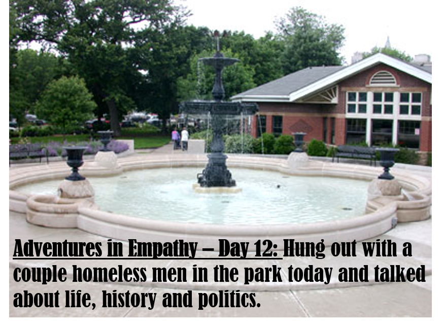 I’ve been posting each day’s action on the Adventures in Empathy Facebook page. The posts are not intended as boastful solicitations of a pat on the back, but rather function as an accountability tool for me. For those following me, I hope to break up the polarized newsfeeds and thought processes, and hopefully start a different type of dialogue. Finally, I hope to demonstrate that active empathy can be an everyday part of our lives. It requires a mental and emotional commitment to change the way you engage with ideas and people; however, it doesn’t actually require a significant time commitment.